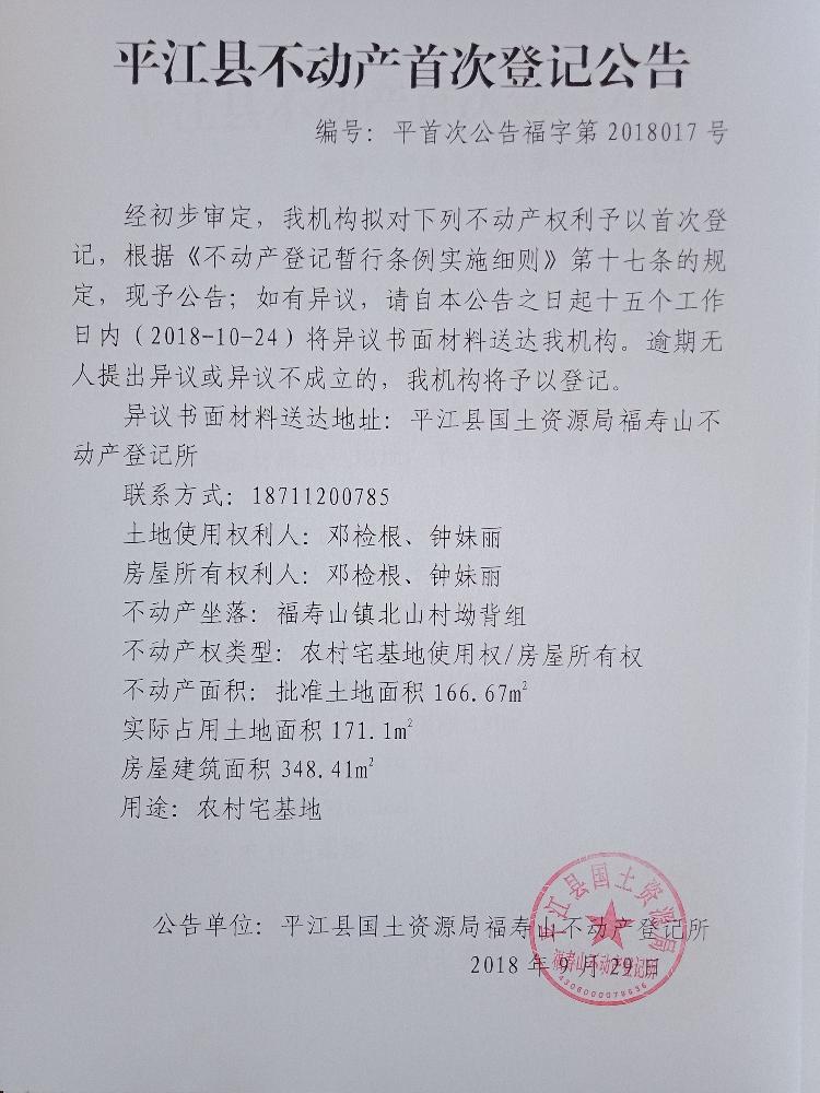 邓检根 钟妹丽不动产首次登记公告 福字第2018017号