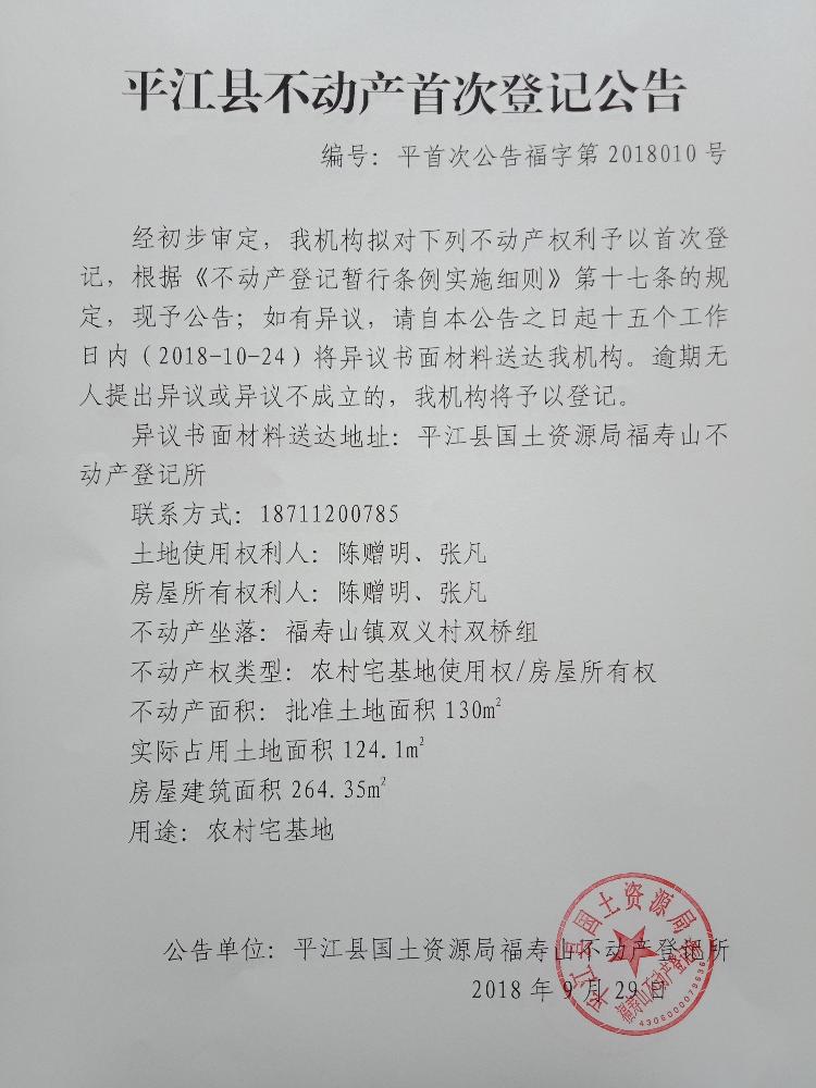 陈赠明 张凡平江县不动产首次登记公告 福字第2018010号