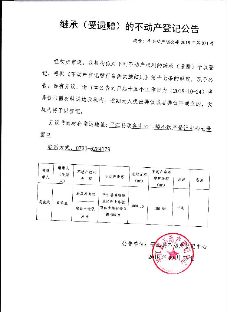 黄添生继承(受遗赠)的不动产登记公告平首次公告继公字2018年第071号