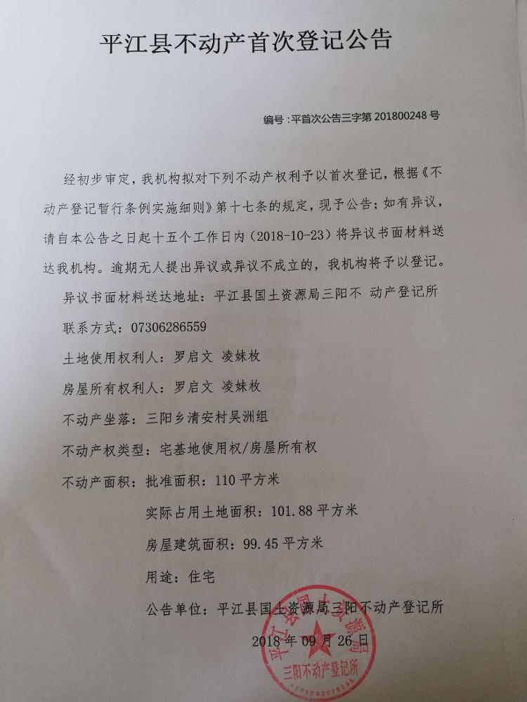 平江县三阳乡 罗启文 凌妹枚 不动产首次登记公告