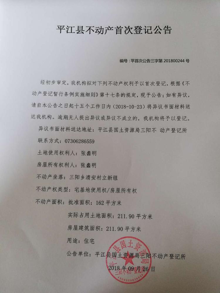 平江县三阳乡 张蠢明 不动产首次登记公告