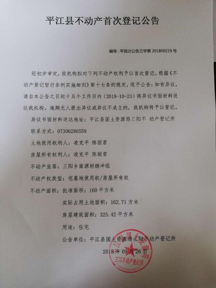 平江县三阳乡 凌克平 陈丽君 不动产首次登记公告