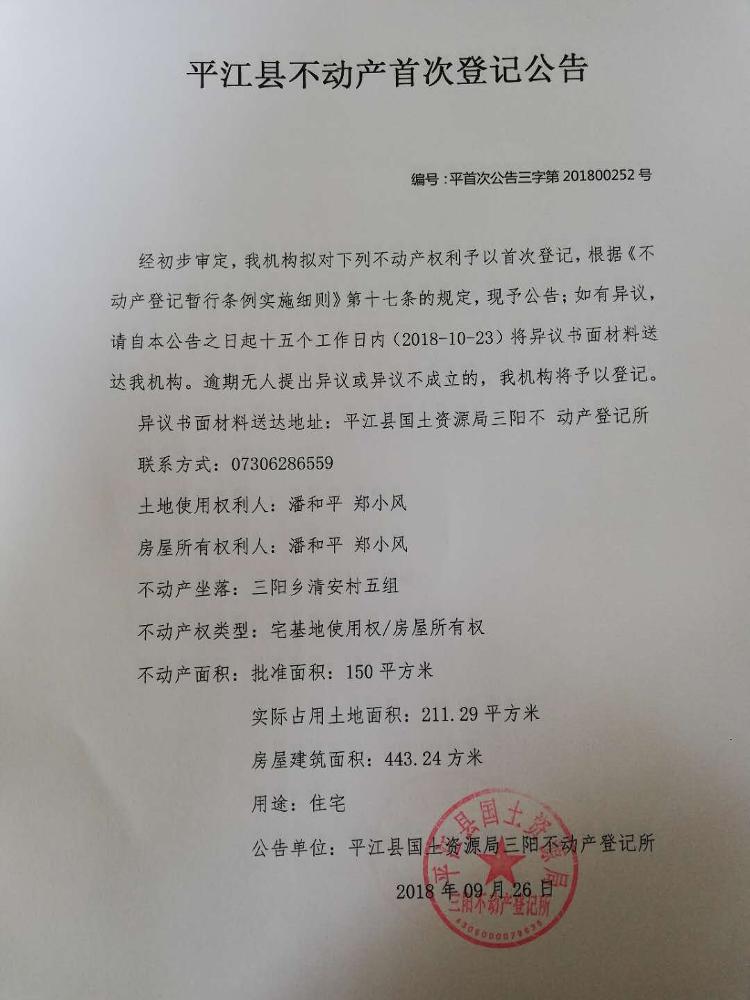平江县三阳乡 潘和平 郑小风 不动产首次登记公告