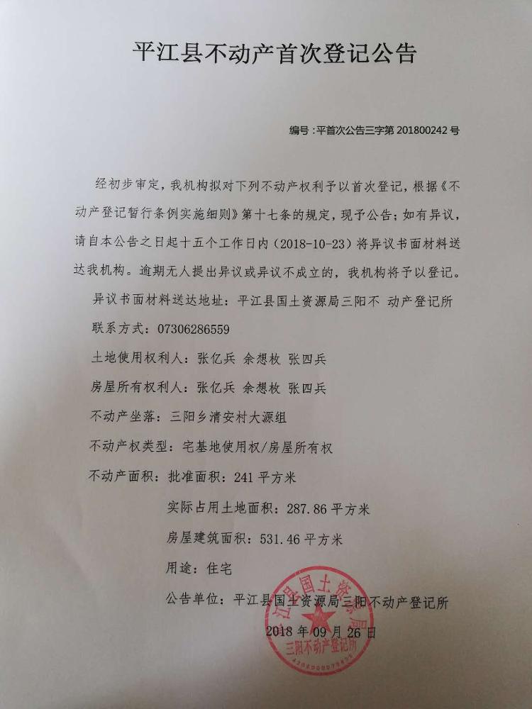 平江县三阳乡 张亿兵 余想枚 张四兵 不动产首次登记公告
