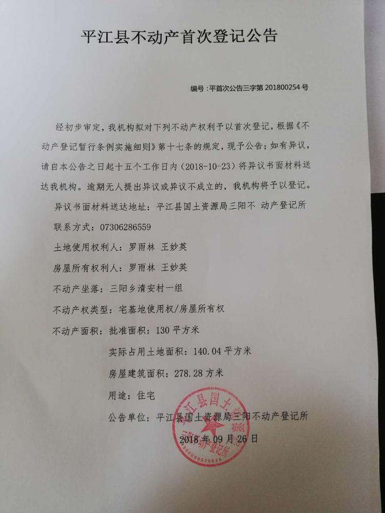 平江县三阳乡 罗雨林 王妙英 不动产首次登记公告