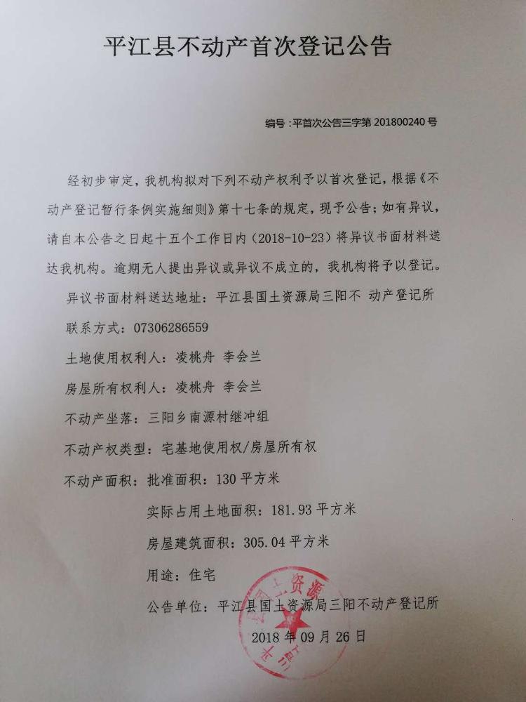 平江县三阳乡 凌桃舟 李会兰 不动产首次登记公告