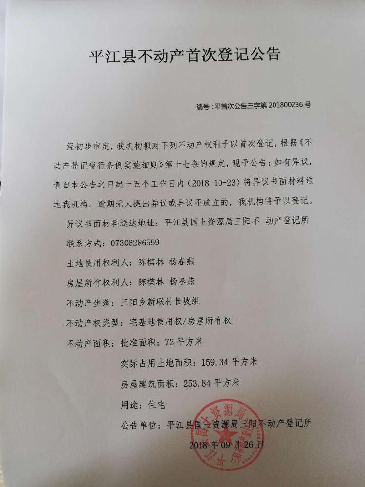 平江县三阳乡 陈槟林 杨春燕 不动产首次登记公告