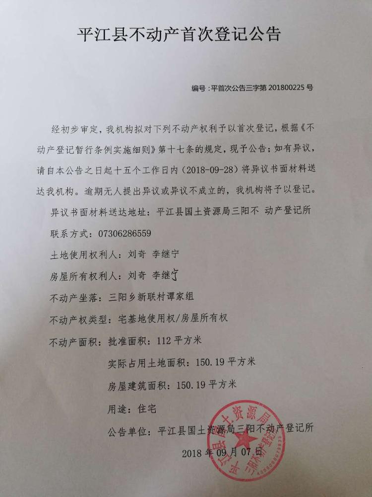 平江县三阳乡 刘奇 李继宁 不动产首次登记公告