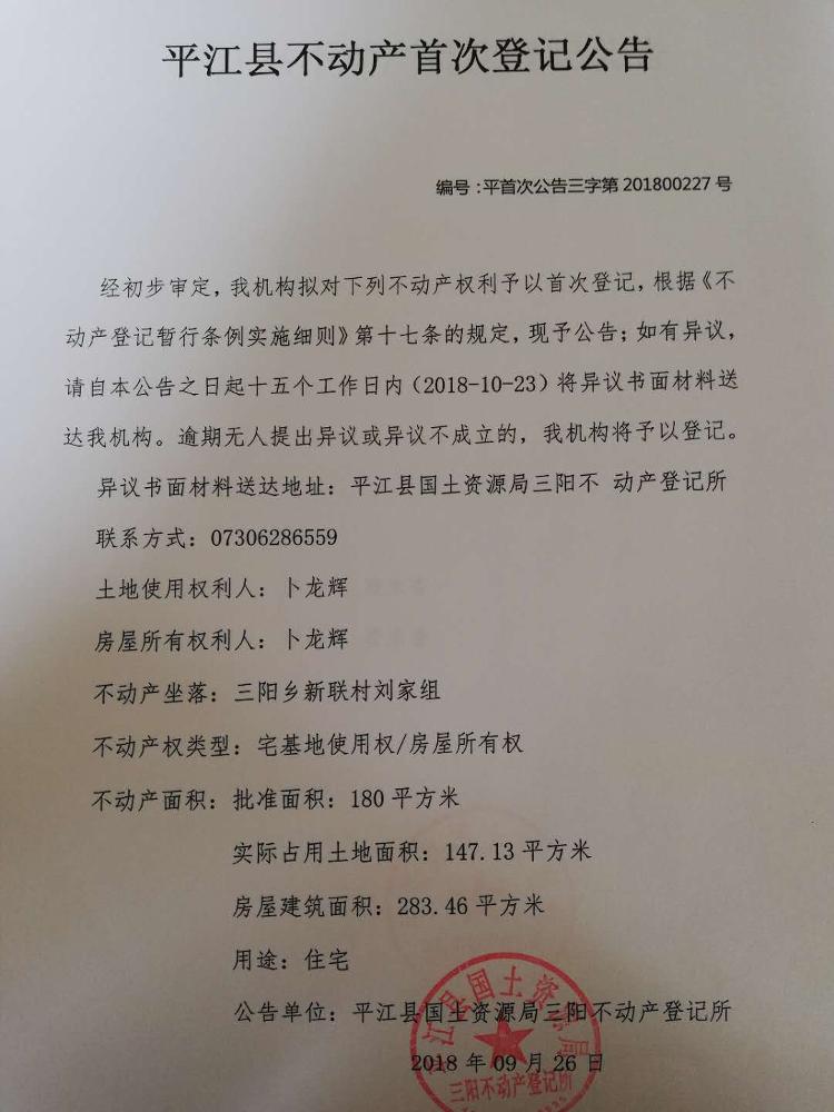 平江县三阳乡 卜龙辉 不动产首次登记公告