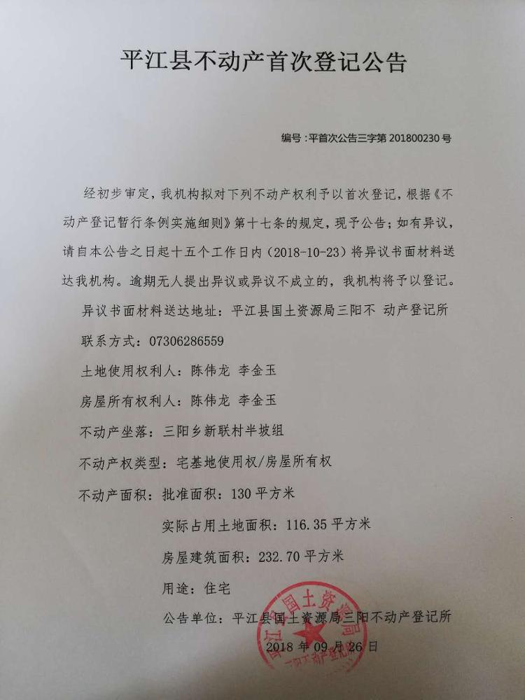 平江县三阳乡 陈伟龙 李金玉 不动产首次登记公告