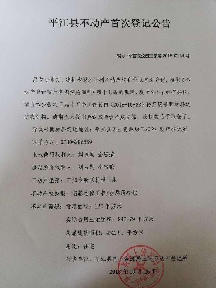 平江县三阳乡 刘占勤 全密荣 不动产首次登记公告