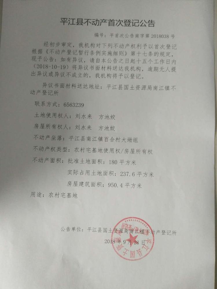 刘水来 方池姣平江县不动产首次登记公告 南字第2018038号
