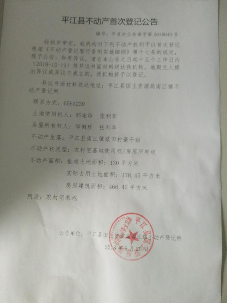 邹谢珍 张利华平江县不动产首次登记公告 南字第2018043号