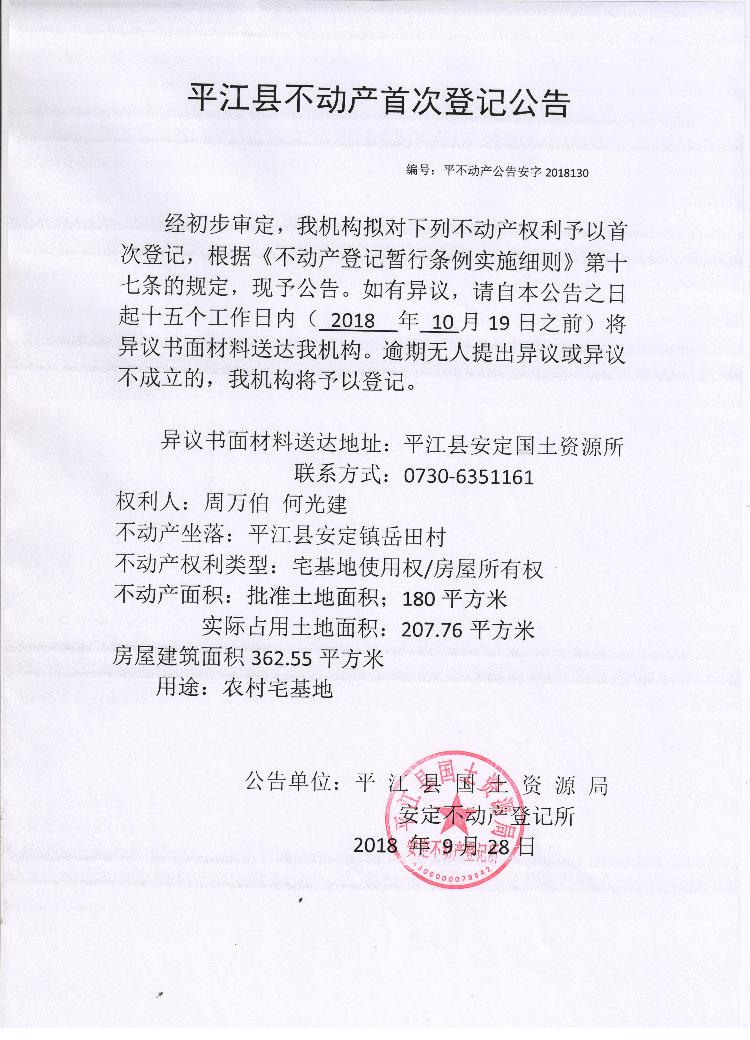 周万伯 何光建平江县不动产首次登记公告 安字2018130