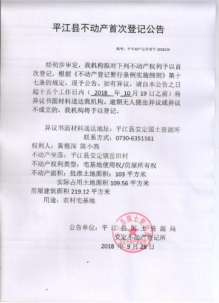 黄根深 陈小燕平江县不动产首次登记公告 安字2018129