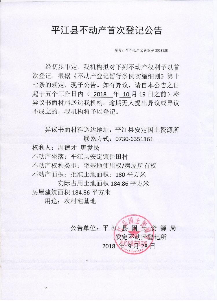 周德才 唐爱民平江县不动产首次登记公告 安字2018128