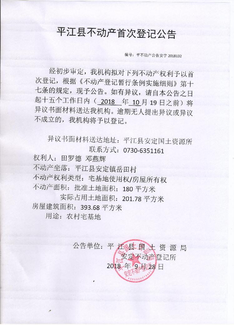 田罗德 邓燕辉平江县不动产首次登记公告 安字2018132