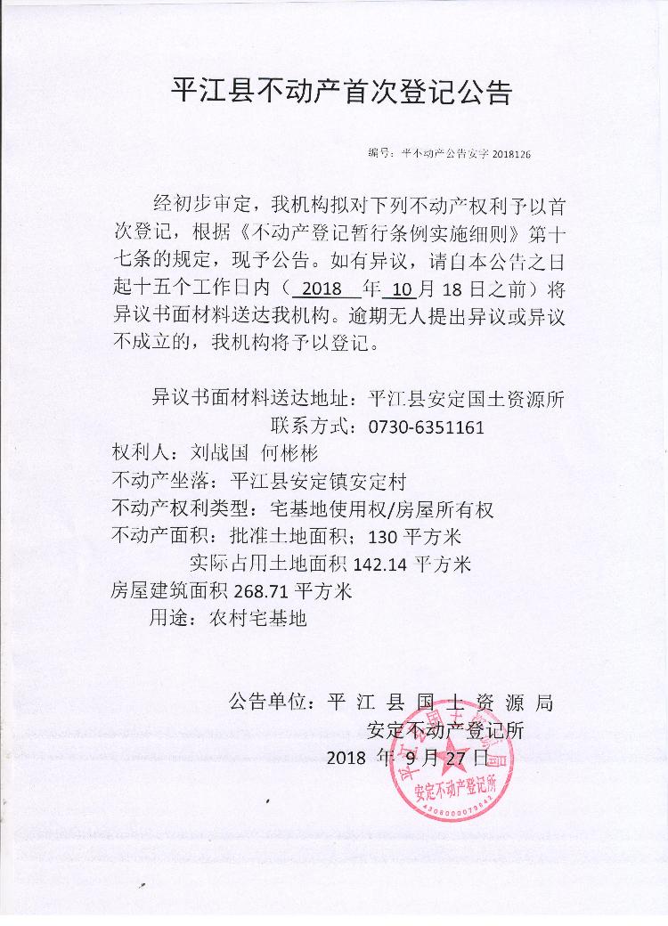 刘战国 何彬彬平江县不动产首次登记公告 安字2018126