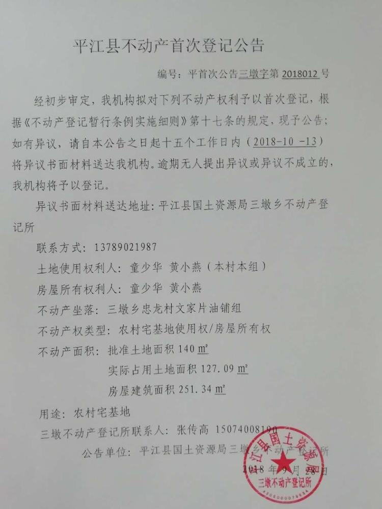 童少华 黄小燕平江县不动产首次登记公告 三墩字第2018012号