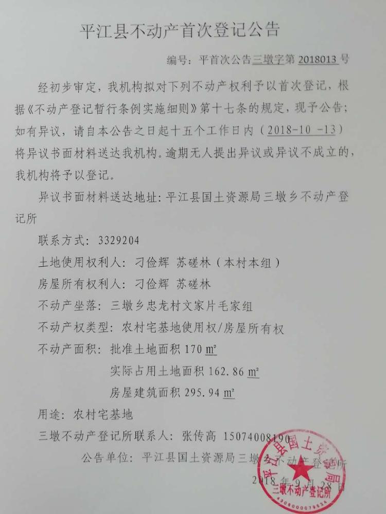 刁俭辉 苏磋林平江县不动产首次登记公告 三墩字第2018013号