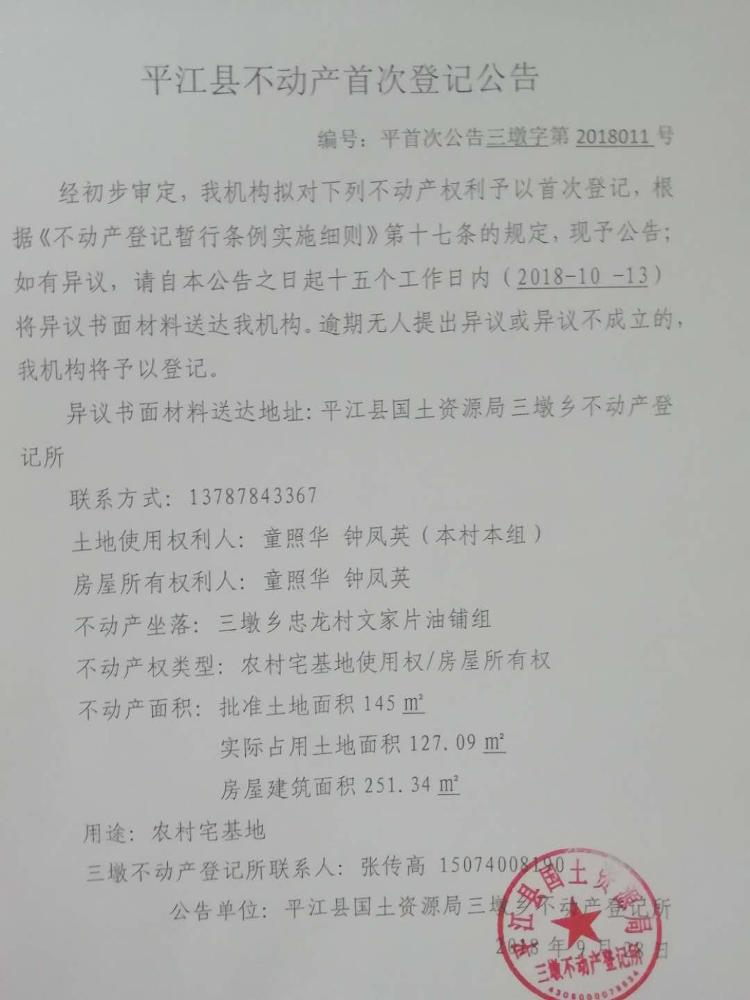 童照华 钟凤英平江县不动产首次登记公告 三墩字第2018011号