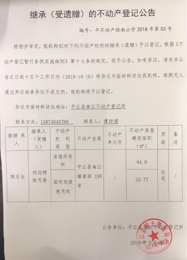 何远辉 陈可香继承(受遗赠)的不动产登记公告平不动产南公字2018年第03号