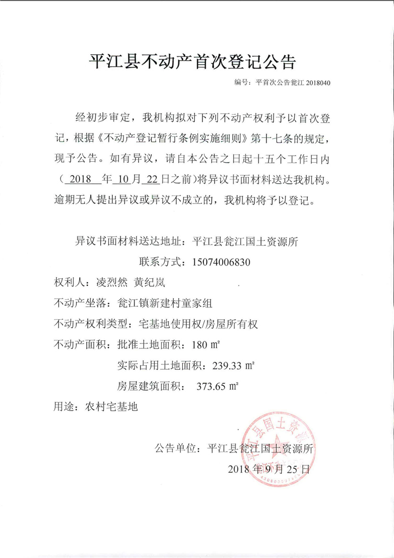 凌烈然 黄纪岚不动产首次登记公告 瓮江2018040