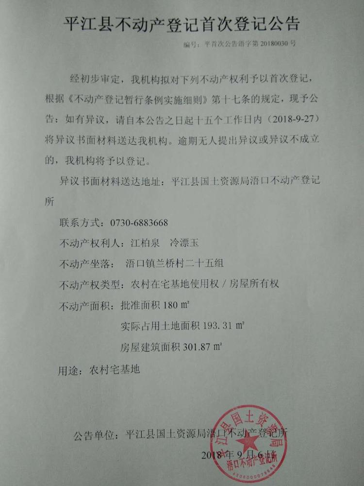 江柏泉 冷漂玉不动产首次登记公告平首次公告浯字第20180030号