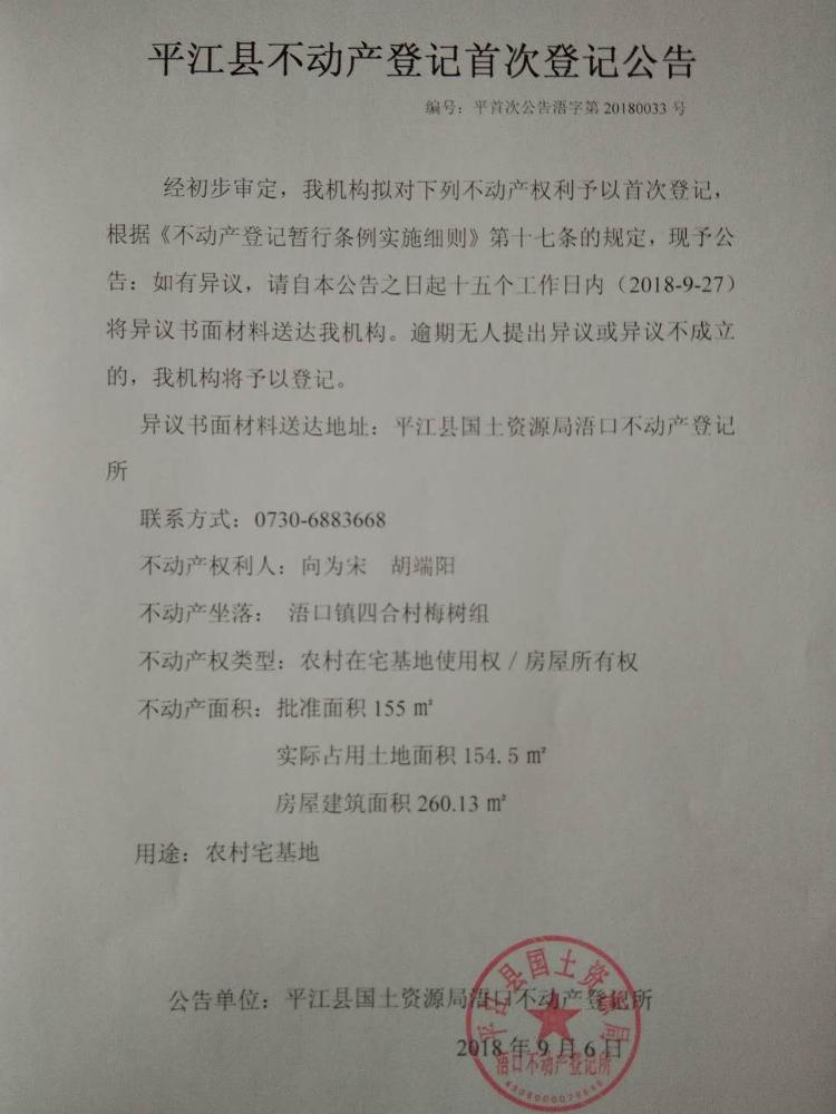 向为荣 胡端阳不动产首次登记公告平首次公告浯字第20180033号