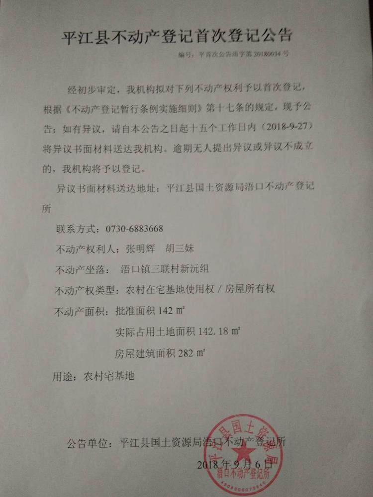 张明辉 胡三妹不动产首次登记公告平首次公告浯字第20180034号
