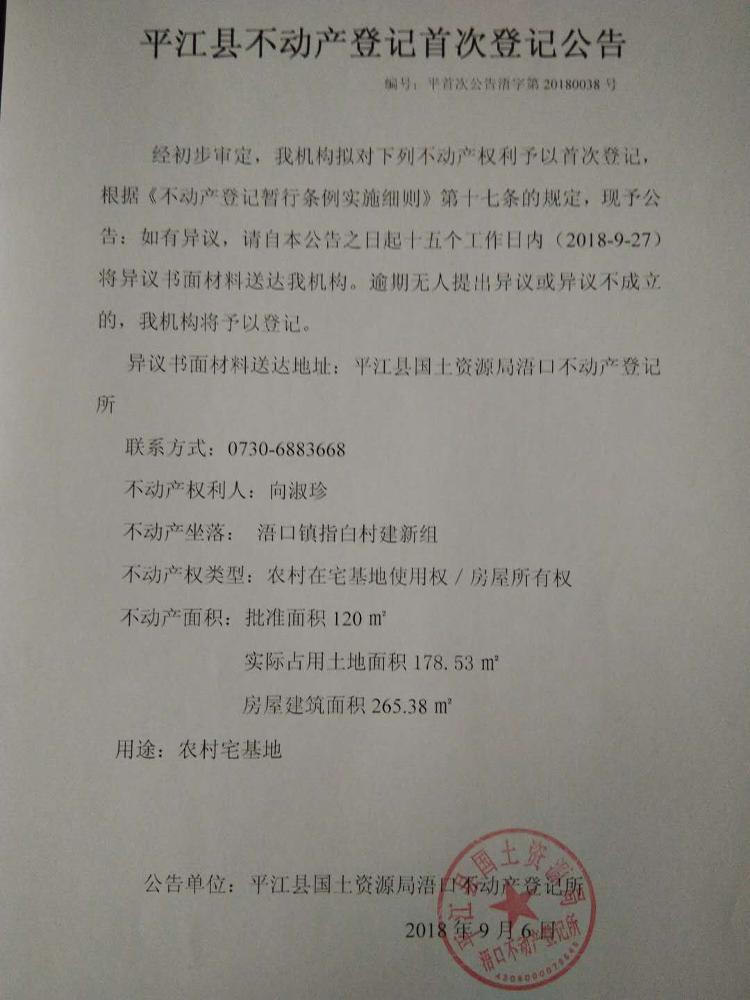 向淑珍不动产首次登记公告平首次公告浯字第20180038号