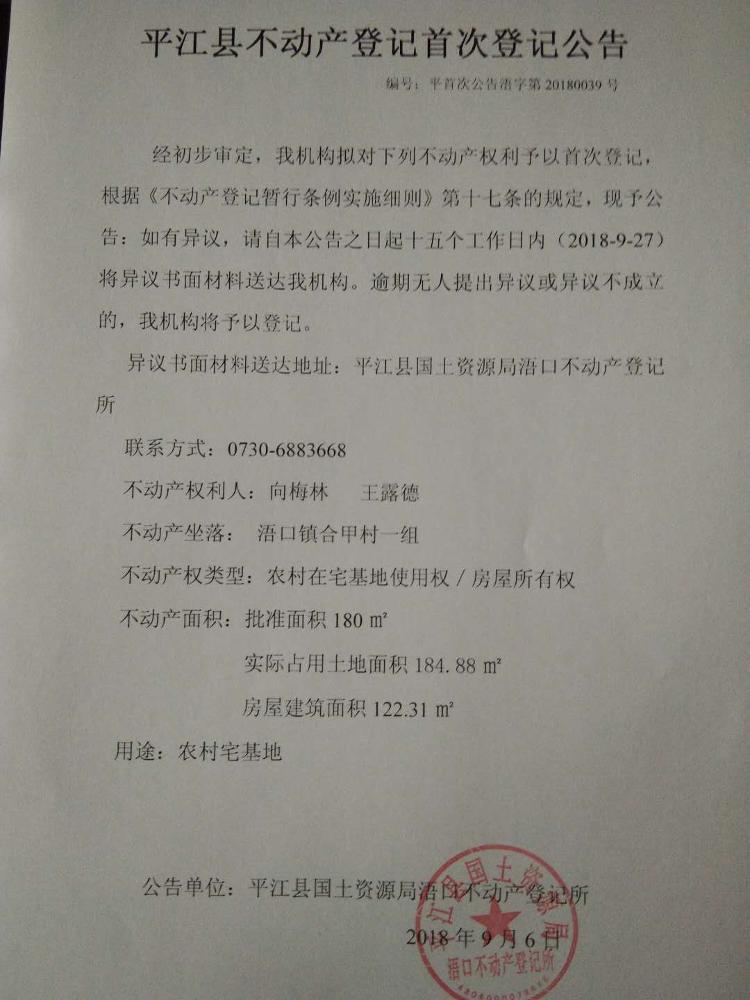 向梅林 王露德不动产首次登记公告平首次公告浯字第20180039号