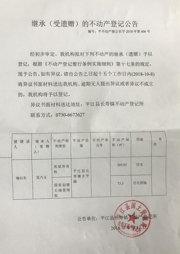 吴六玉继承(受遗赠)的不动产登记公告平不动产继公长字2018年第006号