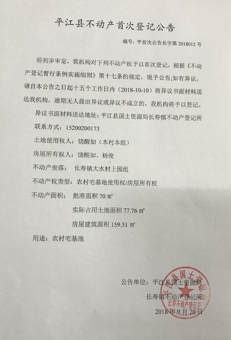 饶醒如 杨俊不动产首次登记公告平首次公告长字第2018012号
