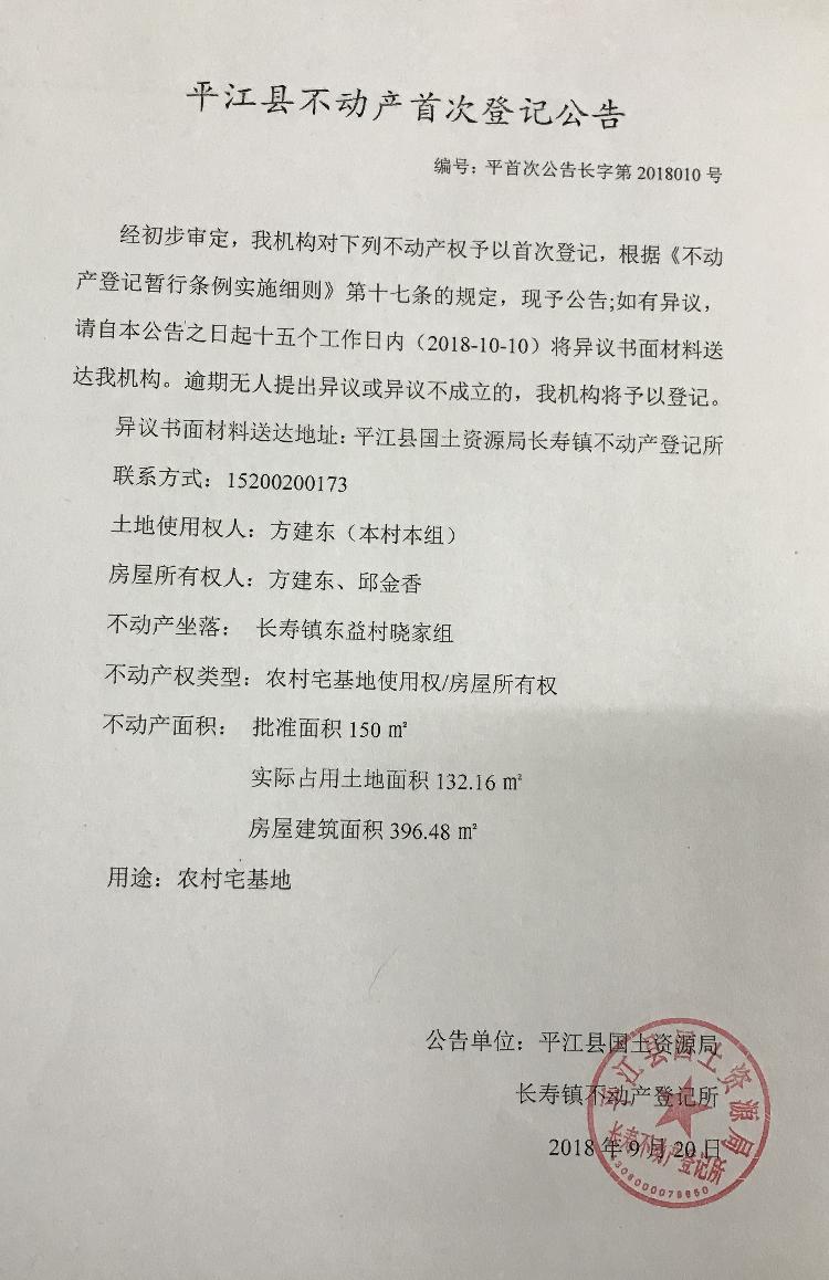 方建东 邱金香不动产首次登记公告平首次公告长字第2018010号
