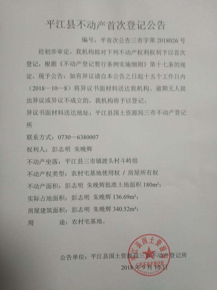 彭志明 朱晚辉不动产首次登记公告平首次公告三市字第2018026号