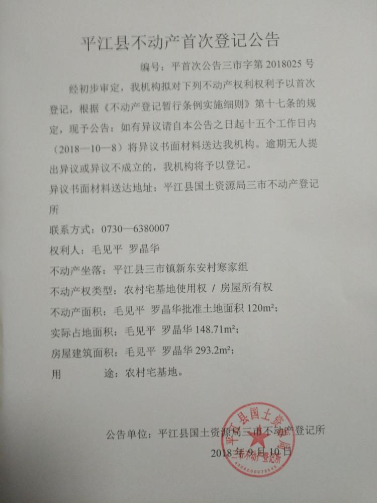 毛见平 罗晶华不动产首次登记公告平首次公告三市字第2018025号
