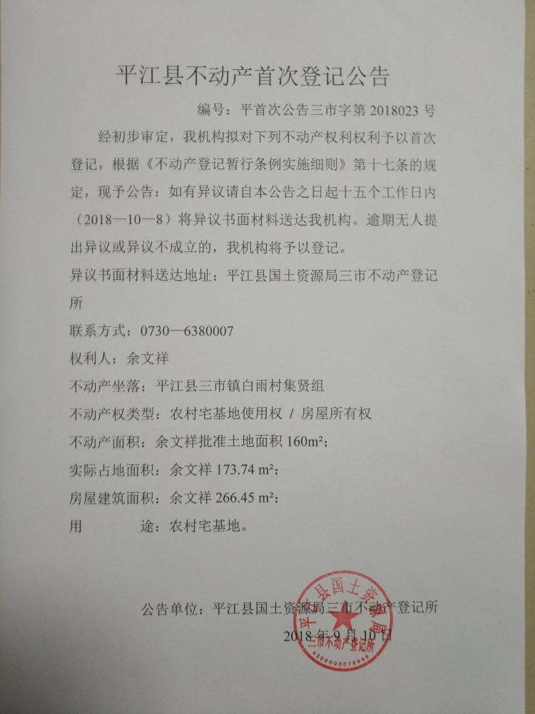 余文祥不动产首次登记公告平首次公告三市字第2018023号