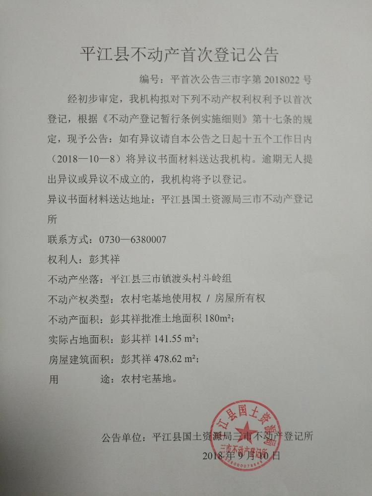 彭其祥不动产首次登记公告平首次公告三市字第2018022号