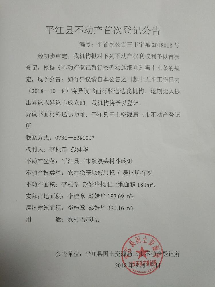 李桂章 彭妹华不动产首次登记公告平首次公告三市字第2018018号