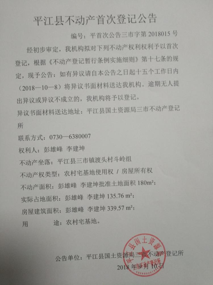 彭雄峰 李建坤不动产首次登记公告平首次公告三市字第2018015号