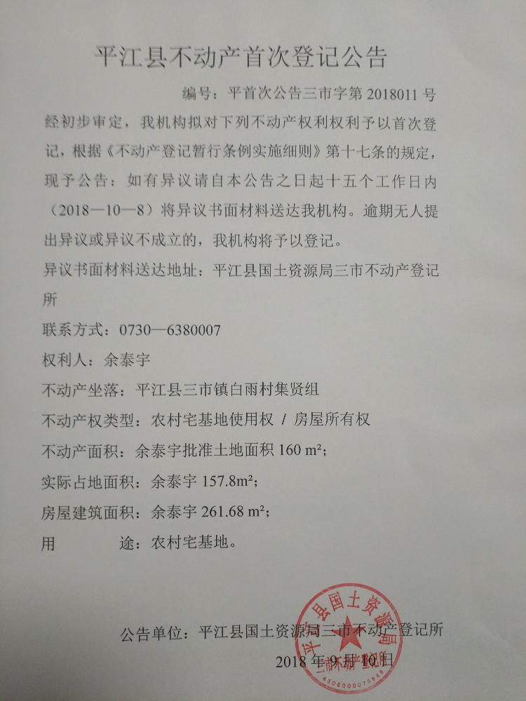 余泰宇不动产首次登记公告平首次公告三市字第2018011号