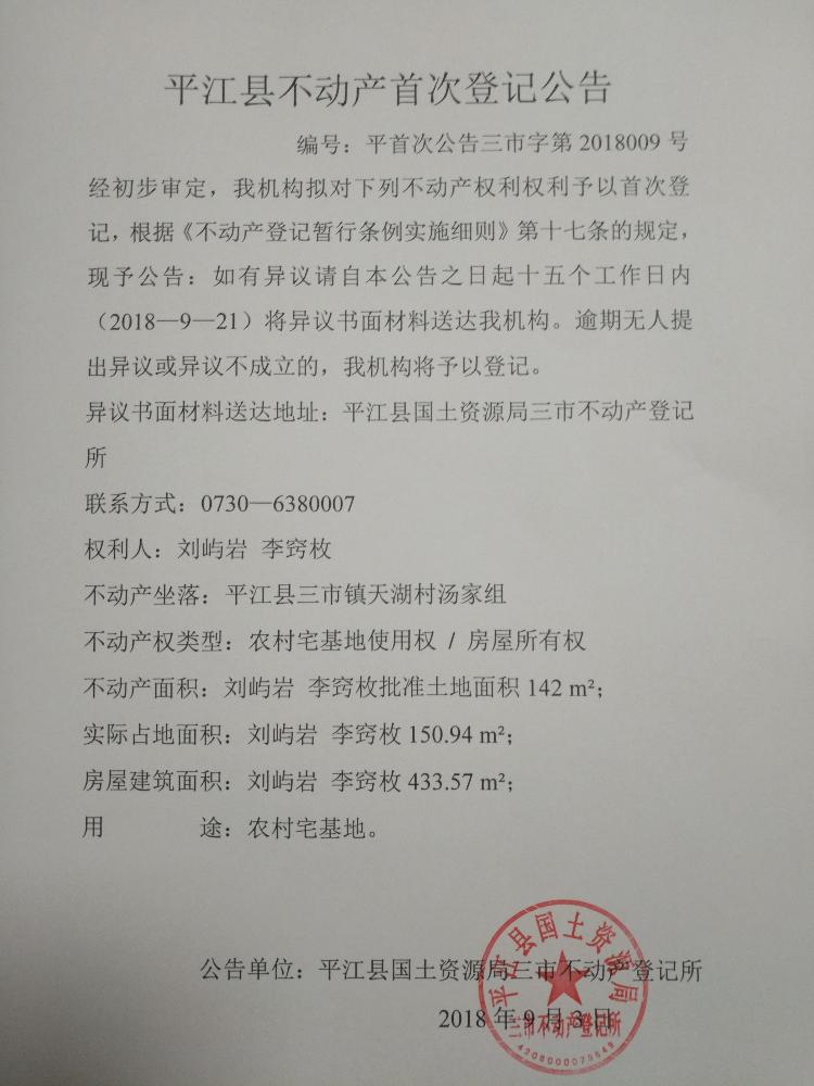 刘屿岩 李窍枚不动产首次登记公告平首次公告三市字第2018009号
