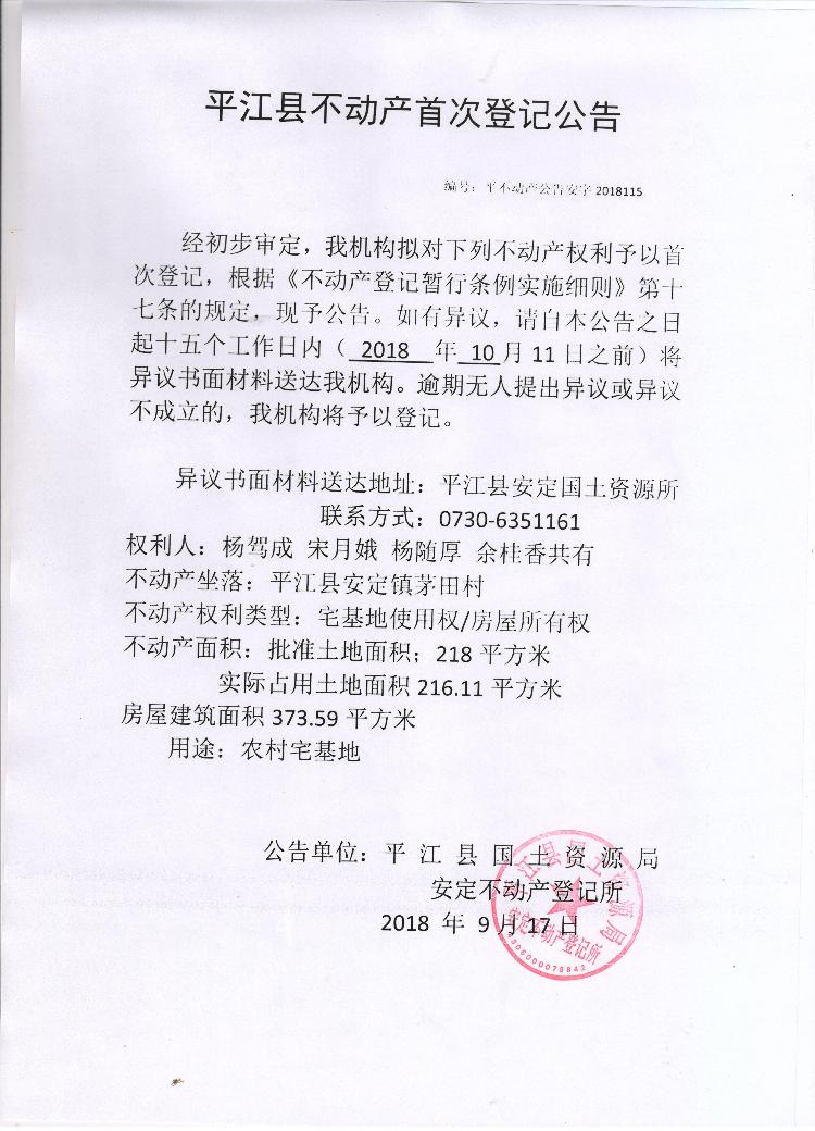 杨驾成 宋月娥 杨随厚 余桂香不动产首次登记公告 安字2018115