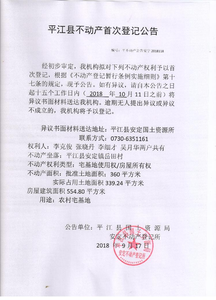 李克俊 张晓丹 李细才 吴月华不动产首次登记公告 安字2018118