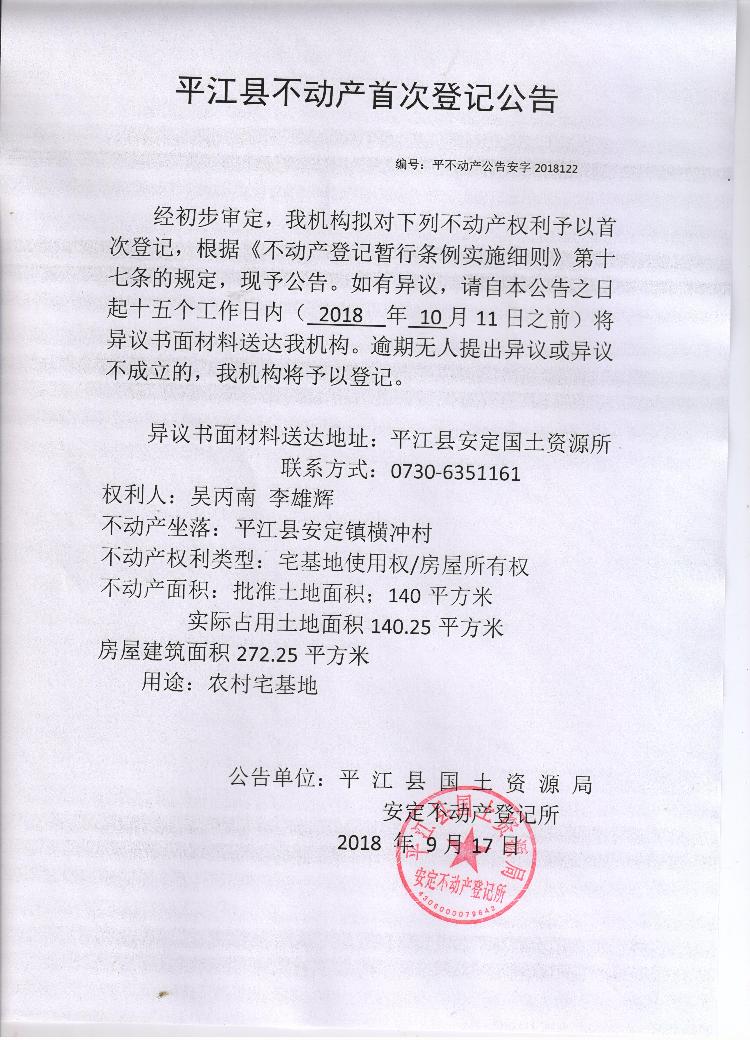 吴丙南 李雄辉不动产首次登记公告 安字2018122