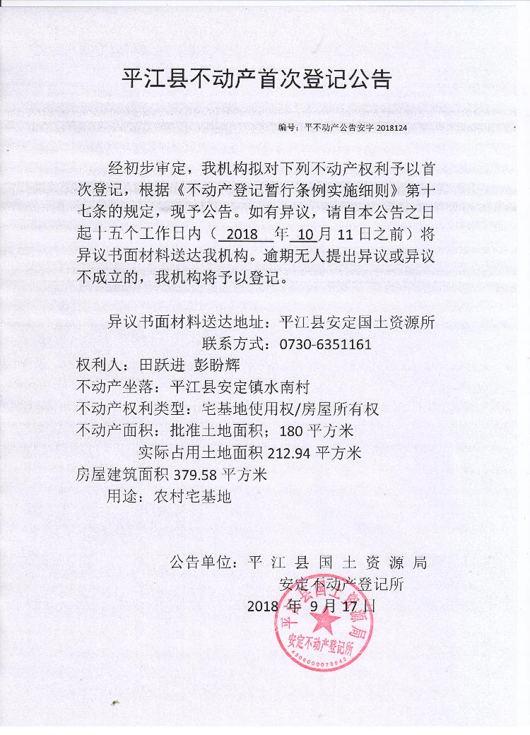 田跃进 彭盼辉不动产首次登记公告 安字2018124