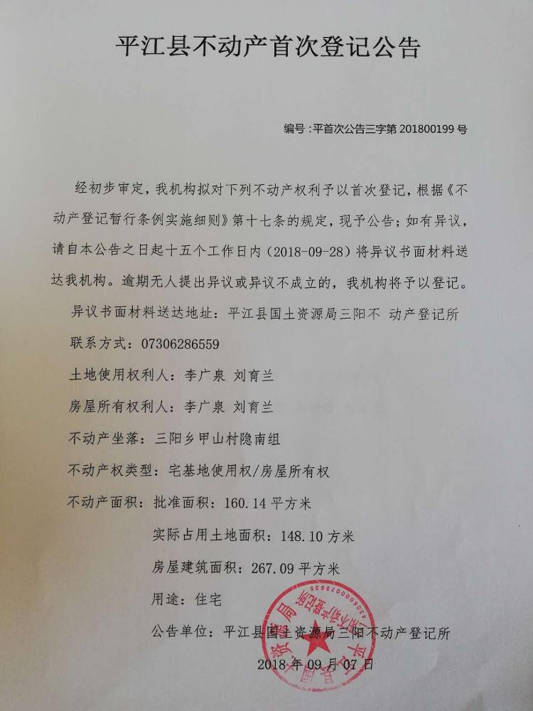 三阳乡李广泉 刘育兰 不动产首次登记公告
