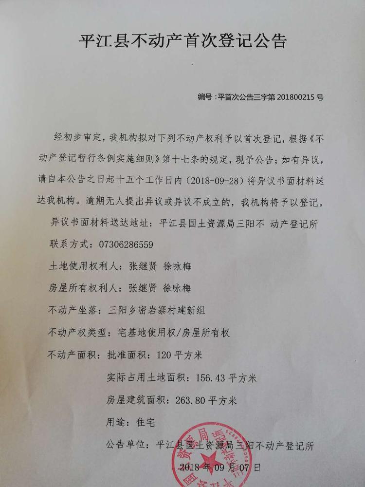 三阳乡张继贤 徐咏梅 不动产首次登记公告