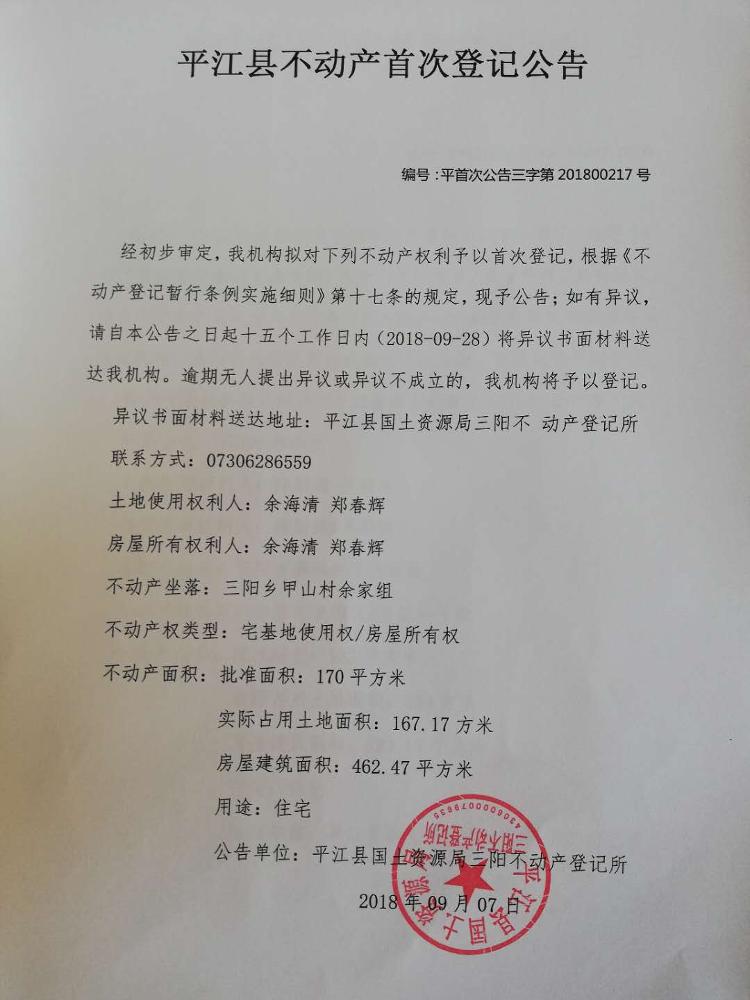 三阳乡余海清 郑春辉 不动产首次登记公告